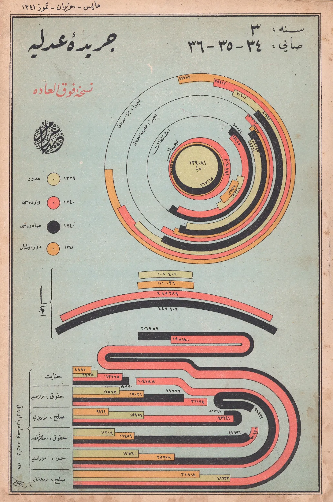 While the content of the publication is admittedly a bit dry—most of the charts cover things like the number of cases filed or decided in a certain province in a given year and the general categories those cases fell in—the visualizations themselves are energetic and bold, with saturated colors and lots of topsy-turvy type. Their focus on balance and encircling forms calls to mind classic Islamic arabesques as well as newer modes of early 20th-century graphic abstraction, like sociologist W. E. B. Du Bois’ hand-drawn infographics of African-American life that were created for the Paris World Fair of 1900.